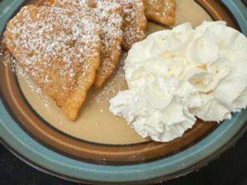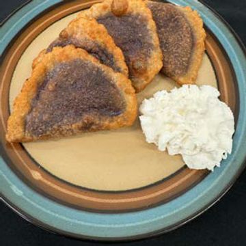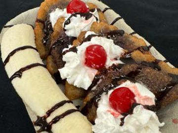 4 perogies Blueberry, apple, strawberry, Banana cream pie perogies, Whipping cream, Maraschino cherries Chocolate sauce,