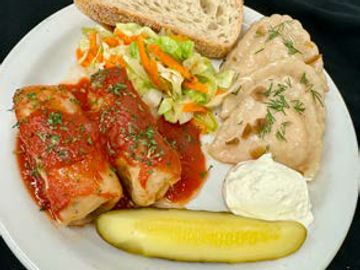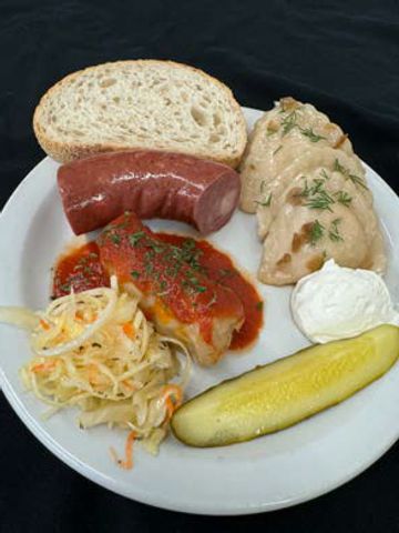 1 holubets, 1 kovbasa, 2 verenyky, pickle & sour cream