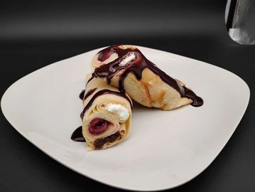 Thin, delicate crepes rolled and filled with cottage cheese, sweet poppy seeds, and tart sour cherries.