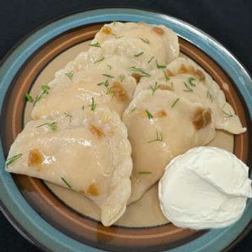 4 verenyky, 2 holubets, dill pickle, Vegan sour cream,